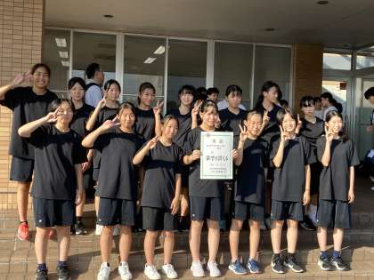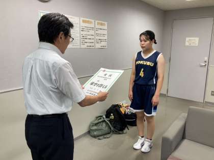 女子バスケットボール、部長が代表して表彰を受けました。おめでとうございます。