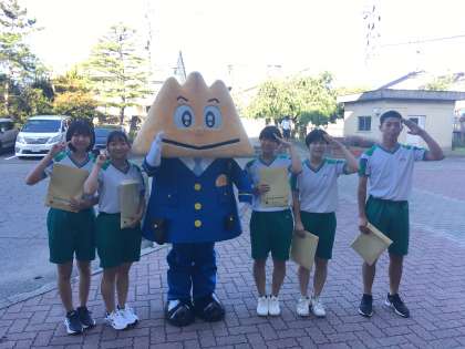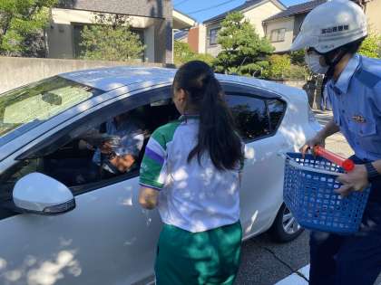 9/19(火)秋の全国交通安全運動への協力 公開日 2023/09/19 更新日 2023/09/19 北中NEWS 7:30〜8:00の活動でしたが、ドライバーの方々から「ご苦労様」のねぎらいの言葉をいただきました。毎日愛情を注いでサツマイモを育てた北中生の思いが、「思いやり」となって交通安全の向上につながってほしいと願います。 なお、今回の活動には、富山テレビさんの取材がありました。今日のお昼のニュースで放送の予定だそうです。