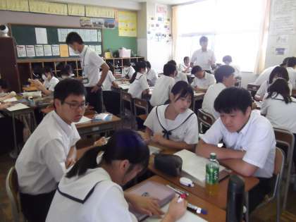 9/23(土)3学年 学習参観の様子 公開日 2023/09/23 更新日 2023/09/23 北中NEWS 3年生は、数学、社会、英語の授業に臨んでいます。 数学では、グループになって、2次方程式を利用して箱の高さを求めようとしていました。