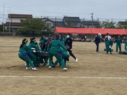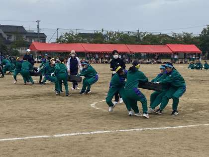写真は、3年女子「タイヤ引き」の予選の様子です。