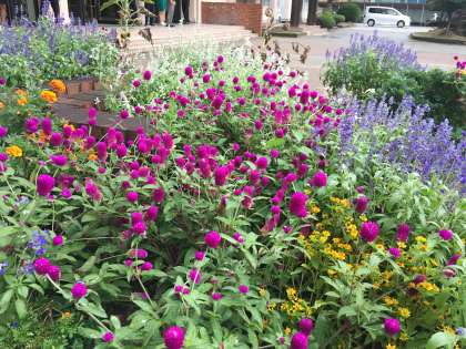 前庭の花々は、キラキラの笑顔で、生徒を迎えています。