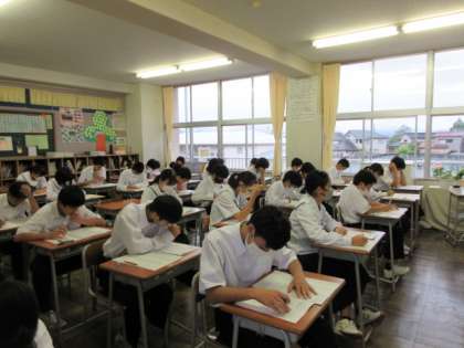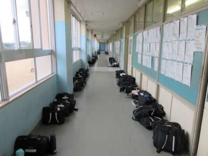 今日から、中間評価が始まりました。テストを受けるときは、黒カバンを廊下に整頓して置いています。どの学年も、本日3教科のテストがあります。学習の成果が出るよう、集中して取り組んでいます。
