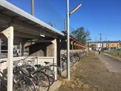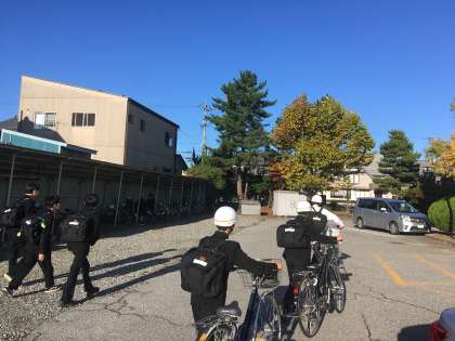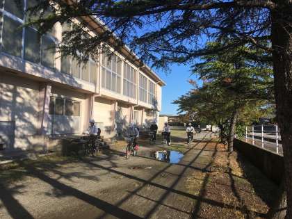秋晴れの空のもと、生徒は元気に登校しています!! 自転車小屋の自転車も、綺麗に整頓されています!!