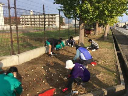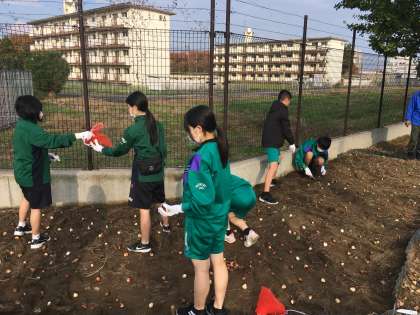 11/5(日)花の道づくり事業 その2 公開日 2023/11/05 更新日 2023/11/05 北中NEWS 今回はチューリップの球根を植えました。 最初に、土の上に球根を並べ位置を決めます。その後、スコップで土を掘って植えていきます。球根の背の高さの3倍の深さに植えるとよいと地域の方に教えてもらいました。