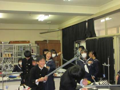 2年4組理科の授業の様子 公開日 2023/12/09 更新日 2023/12/09 北中NEWS 静電気の学習をしました。塩ビ管と荷造りテープでつくったクラゲに静電気を発生させ、クラゲを空中に浮かせる実験をしました。生徒の笑顔が輝いていました。