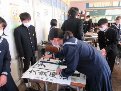 国語の授業では、書き初め練習をしていました。チームで、挑戦しています。なかなか上手です。