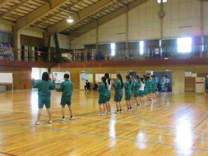 保健体育の授業では、みんなでウォーミングアップのダンスをしていました。楽しそうです。