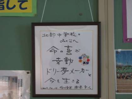 12/13(水) 「命の授業」講演会 公開日 2023/12/13 更新日 2023/12/13 北中NEWS 講師の腰塚先生から北部中学校のみなさんにと、色紙をプレゼントしていただきました。職員室前に飾りました。 本日は、ありがとうございました。