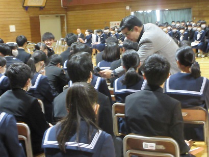 生徒は、首や顔、手を動かしながら、真剣に話を聞きました。