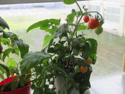 日当たりがよいので、トマトが色付いてきました。職員室前廊下にあります。