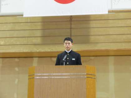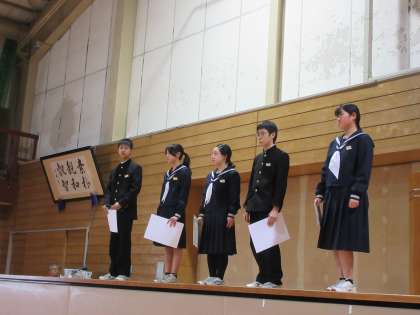 終業式に先立ち、受賞報告、全国大会に出場する女子バレー部の壮行会、3年生代表生徒からの意見発表を行いました。校長から、「有り難う」の言葉の大切さについて話がありました。当たり前だと思っていることが当たり前でない人たちがいます。当たり前と思う毎日に感謝の気持ちをもって、新しい年を迎えましょう。