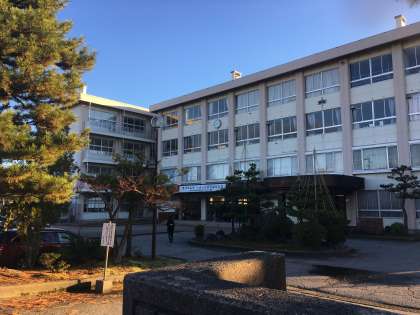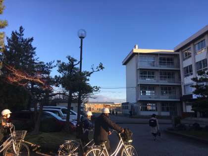対馬海峡付近に中心を持つ高気圧が、西日本から東日本を覆っており、富山県はおおむね晴れています。ここ北部中学校も、雲ひとつない青空が広がっています。