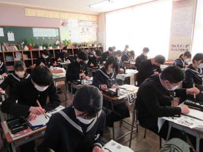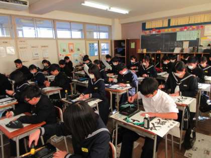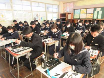 1/9(火)校内書き初め大会 公開日 2024/01/09 更新日 2024/01/09 学校行事 始業式後、書き初め大会を行いました。 今年の揮毫文字は、1年生「文武両道」、2年生「称名の滝」、3年生「国際交流」です。 みんな集中して書きました。
