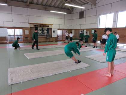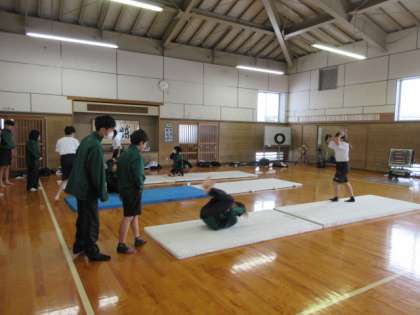 保健体育の授業では、マット運動に取り組んでいます。伸しつ後転、膝が伸びていて美しいです!
