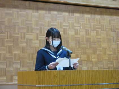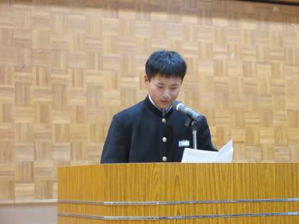 2年生は6時間目に学年集会を行いました。各クラスの代表者が、「今年の抱負」を発表しました。あと少しで3年生になることから、部活動や受検に向けた勉強を頑張りたい、という声が多く聞かれました。代表者4人は、緊張した様子でしたが、はきはきと立派に発表していました。