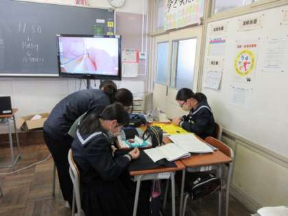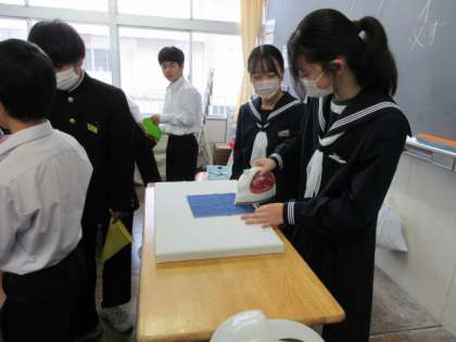 技術・家庭科の家庭分野では、マイエコバッグをつくっています。ポケットになる部分のアイロンをかけていました。教え合いながら、作業を進めています。