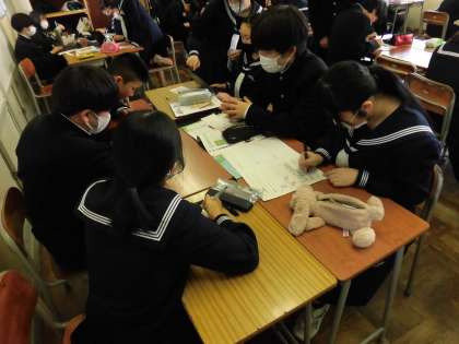 1/22(月) 高校調べ(2学年) 公開日 2024/01/22 更新日 2024/01/22 第2学年 班で協力して、「進路のしおり」等を用いて高校についての調べ学習をしています。 それぞれの班で作成した資料は、掲示板に貼り学年全員で共有します。