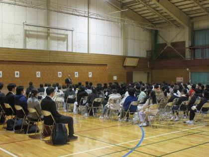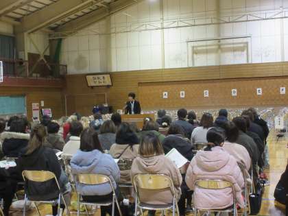 体育館では、はじめに校長が、対象児童と保護者に挨拶をし、その後教務主任・生徒指導主事・教頭・育友会会長が入学に当たっての留意事項等を説明しました。みなさん、とても真剣に話を聞いてくださいました。