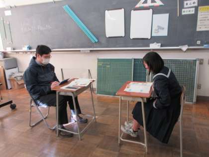 2/7(水) 授業の様子(2学年) 公開日 2024/02/07 更新日 2024/02/07 第2学年 英語の授業の、スピーキングテストの様子です。ALTと1対1で受けるので、緊張すると言っていましたが、頑張っていました。