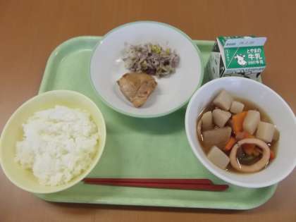 今は、「芋」はジャガイモやサツマイモなどイモ類全般を指しますが、もともとは今日の給食で使われている『里芋』を指していたようです。里芋が中国から日本に伝わったのは、縄文時代です。古くから日本の食文化と密接な関係があったと言えます。富山県では、上市町と南砺市の特産となっています。