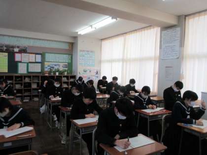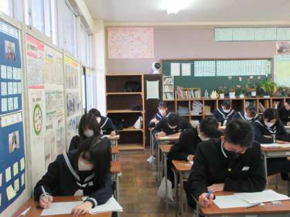 2/15(木) 定期評価の様子(3学年) 公開日 2024/02/15 更新日 2024/02/15 第3学年 3年生は、学年末評価です。これが、中学校生活最後の定期評価です。いろいろなことが、「中学校生活最後」になっていきますね。