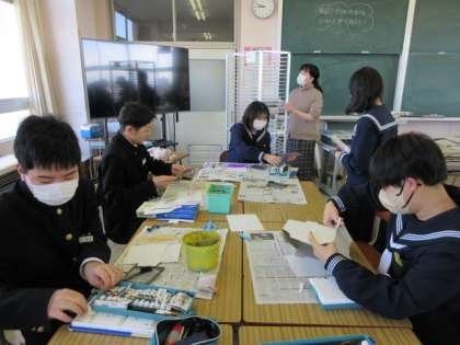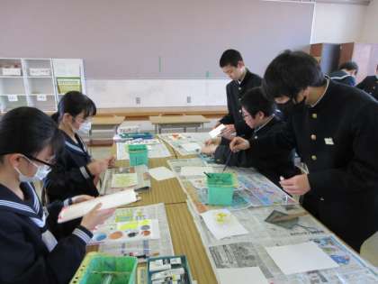 2/28(水) 授業の(1学年)その2 公開日 2024/02/28 更新日 2024/02/28 第1学年 美術の授業の様子です。モダンテクニックに挑戦していました。「あー、絵の具がはみだした!」という声も・・・。予想どおりにはいかないようです。