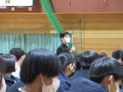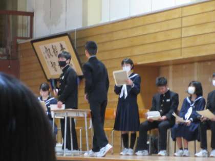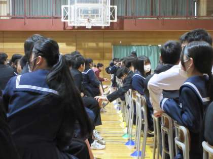 3/18(月) 人権集会 公開日 2024/03/18 更新日 2024/03/18 北中NEWS 6限に、生徒会執行部が人権集会を行いました。生徒会執行部がロールプレイングをし、その様子から一人一人が「気持ち」考えました。周りの人と意見交換したり、意見を発表したりしました。人権について、自分事として考える機会になりました。 生徒会執行部の皆さん、ご苦労様でした。