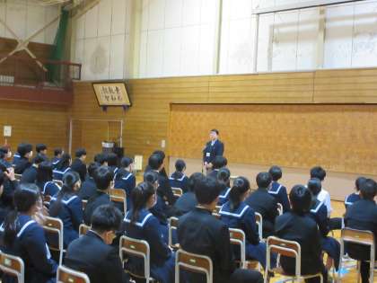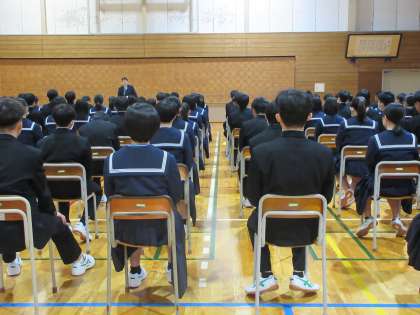 4月8日(月)学年集会(3学年) 公開日 2024/04/08 更新日 2024/04/08 第3学年 1限目に学年集会を行いました。静かに入場し椅子を並べ、縦横の列が乱れることなく整った状態で気持ちよくスタートしました。学年スタッフの紹介後、生活・学習の話しを聞きました。今年の3学年は「考動」「口動」「幸動」の3つの「動」をテーマに活動していこうと決まりました。