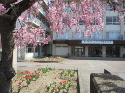 正面のしだれ桜も咲きました。桜の花、花壇のチューリップ、青空、とても美しいです。
