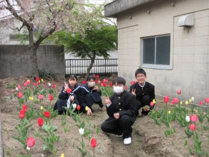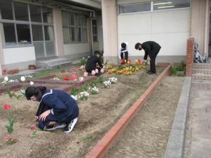 花壇の除草にも、たくさんの生徒が参加しています。ありがとう!花たちもきっと喜んでいるでしょう。