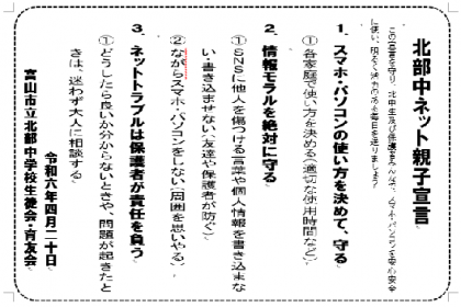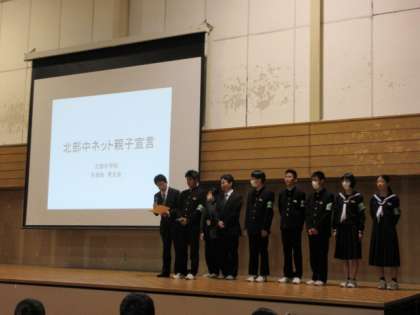 4月20日(土) 北部中ネット親子宣言 公開日 2024/04/20 更新日 2024/04/20 北中NEWS 昨年度から、北部中学校生徒会と育友会、学校で、北部中ネット親子宣言を見直し、本日新たな宣言を行いました。