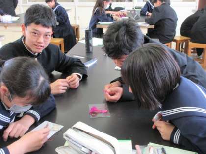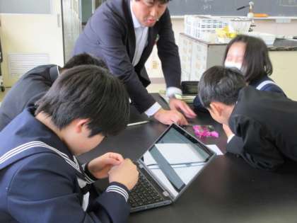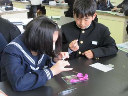 理科の授業の様子です。花のつくりをグループで協力して活動していました。