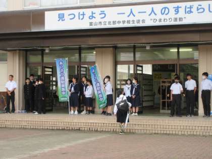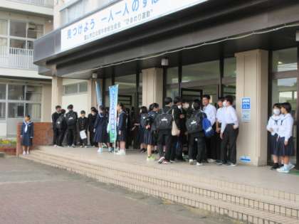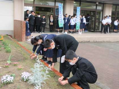 生徒玄関は、あいさつ運動の生徒でにぎわっていました。 花壇の除草もありがとうございます。