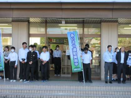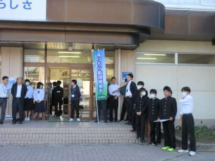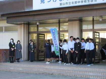 育友会の方々と生徒で生徒玄関はいっぱいです。笑顔で挨拶を交わしています。