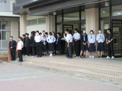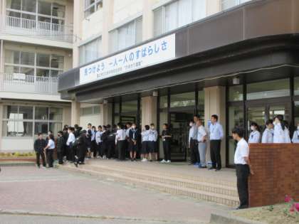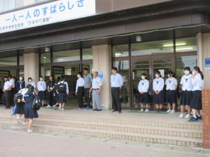 今日も生徒玄関は、あいさつ運動の生徒でいっぱいです。