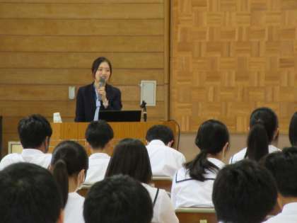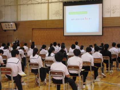「社会に学ぶ『14歳の挑戦』」の事前学習として、富山市企画管理部広報課シティプロモーション推進係 竹村和香奈様を講師としてお迎えし、マナー講座を行いました。