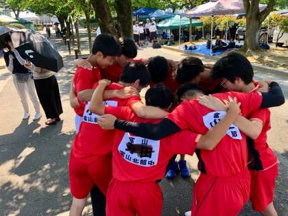 男子ソフトテニス部、試合前に集中を高めました。