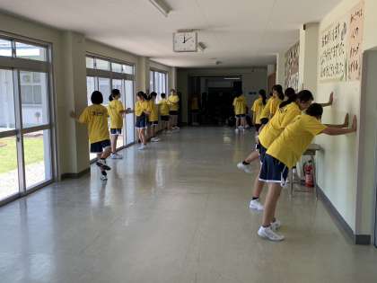 女子バスケットボール部、会場に到着し、体をほぐしています。