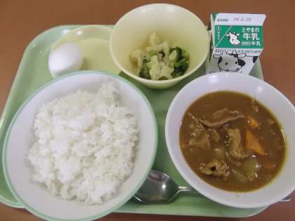 今日は、大人気メニューのカレーライスです。付け合わせは、花野菜サラダとゆで卵です。カレーライスとゆで卵の組み合わせは、学校給食では定番な感じがします。