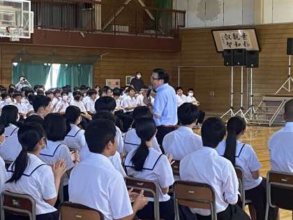 先日、本校の教育後援会さんのご支援で、高原兄さんのミニコンサート「こころが今日も笑顔」が行われました。高原さんの歌声や、歌に込められた思いや願いが心に響き、生徒は次のような感想をもちました。(数名抜粋)