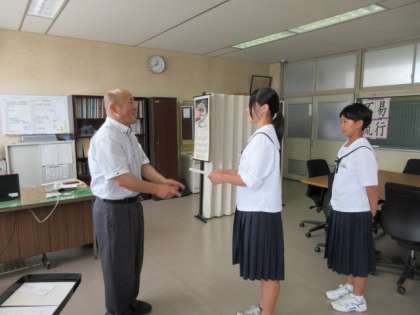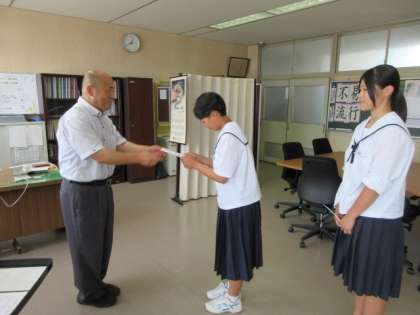 クラブチームの一員として全国大会に出場する生徒に、校長から激励金を渡しました。「日本一を目指して頑張ってきます」との決意表明がありました。頑張れ、北中生!応援しています。