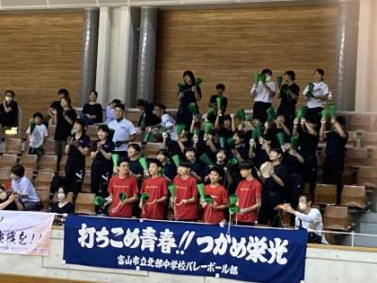 男子バレーボール部です。みんなで頑張りましたが、残念ながら庄川中さんに負けました。次は、3位決定戦。気持ちを切り替えて、頑張れ!北中生!
