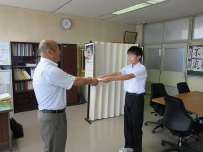 クラブチームの一員として全国大会に出場する選手に、校長から激励金を渡しました。「得点できるよう頑張ってきます」との決意表明がありました。