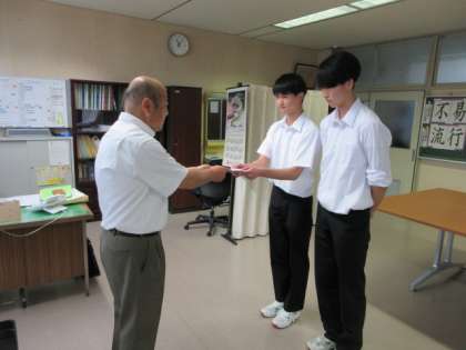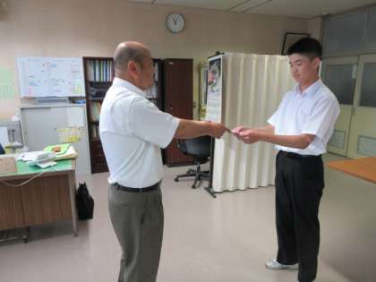富山県中学校総合選手権大会を勝ち抜き、北信越中学校総合競技大会に出場する選手に、校長から激励金を渡しました。「全国大会に出場できるよう、精一杯戦ってきます」との決意表明がありました。強気で頑張れ!北中生!