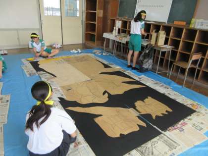 デコレーション係は、どの団も彩色作業です。色の確認をしながら作業を進めていました。