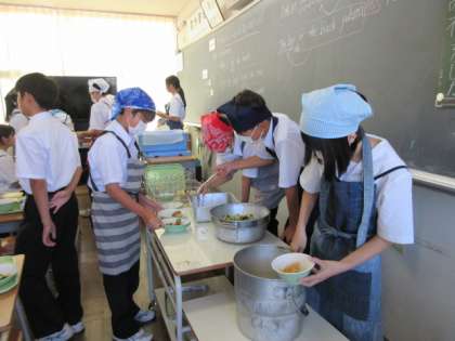 どのクラスも、給食当番がてきぱき、配膳しています!