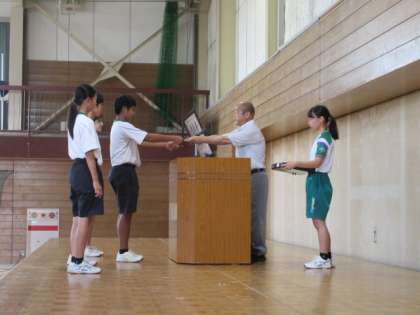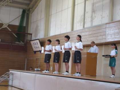 校長先生から新しい生徒会役員が認証書を受け取りました。