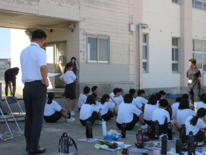 教育実習の先生の研究授業でした。暑い中でしたが、ソフトボールを頑張りました。写真は、振り返りの様子です。どこの塁でアウトにするのか、声を掛け合ってできたようです。