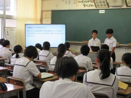 10月4日(金) 総合的な学習の時間 公開日 2024/10/04 更新日 2024/10/04 北中NEWS 2年生は、「社会に学ぶ『14歳の挑戦』」のまとめとしての発表を行いました。来年度「14歳の挑戦」を体験する1年生を発表会に招待しました。お互い、緊張しながらも貴重な体験談を聞くことができたようです。