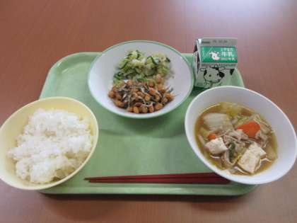 今日は、はくさいなべ!鍋に白菜は欠かせませんが、今年の夏は高温が続いたので、白菜等の葉物野菜が高騰しています。こんな食卓にまで、地球温暖化の影響が・・・。今日は、そんなことを感じながら、給食のありがたさも感じながらいただきました。